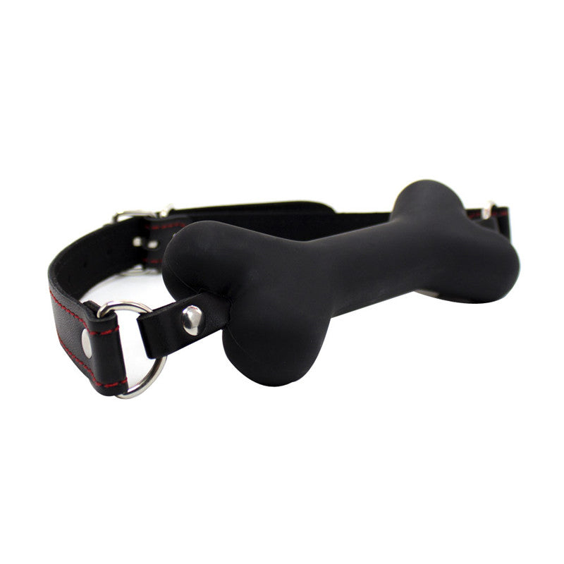 Bâillon souple noir en forme d’os pour chien, sangles en cuir noir réglables et finition par rivets en acier chromé. Matière: simili cuir + Silicone